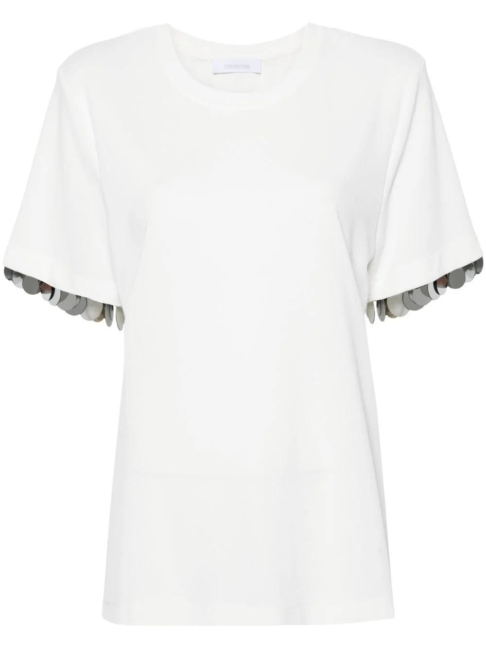 paillette-embellished crepe T-shirt Highlights - White - Crepe texture - Paillette embellishment - Chain-link detailing - Crew neck - Short sleeves - Straight hem Imported Composition Viscose 62%, Polyamide 29%, Elastane 9% SIZE & FIT Model measurements Height 5 ft 10 in(1.77 m) Bust/Chest 32.28 in(82 cm) Hips 35.03 in(89 cm) Waist 25.19 in(64 cm) FittingInformation Designed for a relaxed fit, this piece allows for comfort and movement when worn Made from a midweight non-stretch fabric, this piece offers minimal elasticity when worn This piece fits true to size – take your usual size