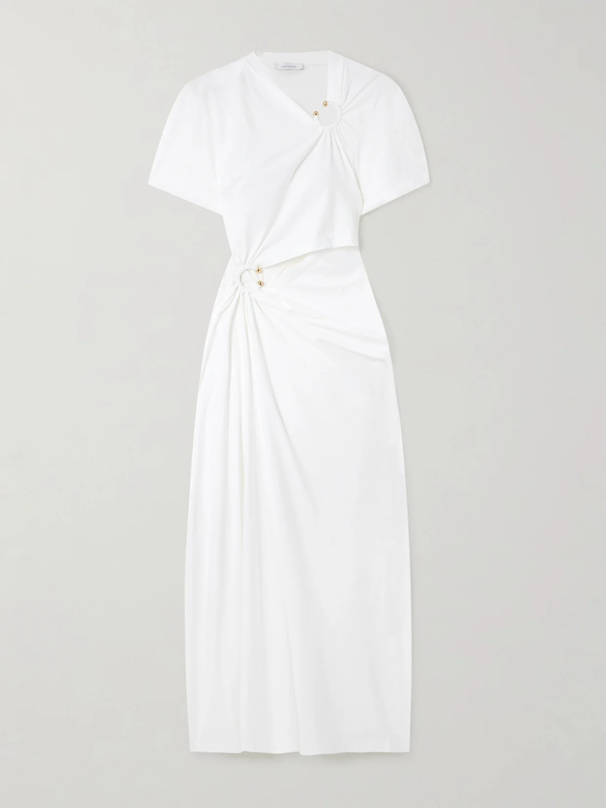 Rabanne finds new, fresh ways to work its signature metalwork into its collections every season. Cut from slinky jersey, this midi dress is loosely draped and accented with gold-tone rings that create cool cutouts.