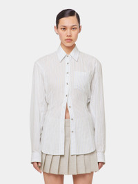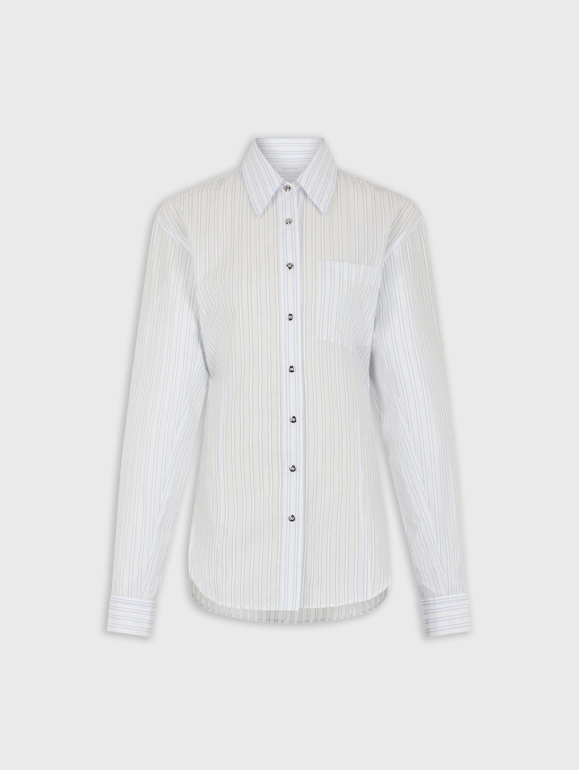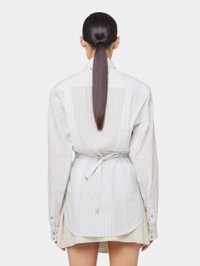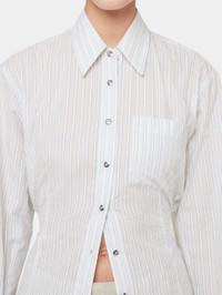 - Colors : White and blue striped - Straight collar - Long sleeves - Detail of a belt to tighten the shirt at the back - Eight chain at the back of the collar and buttons on the sleeves - Single-breasted silver closure DETAILS - Composition : 100% Cotton - Made in Tunisia - Model's height: 180 cm / 5ft 11in - Model wears a size FR 36 / UK 8 / US 4 - This style is true-to-size - We recommend your usual size.