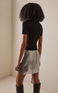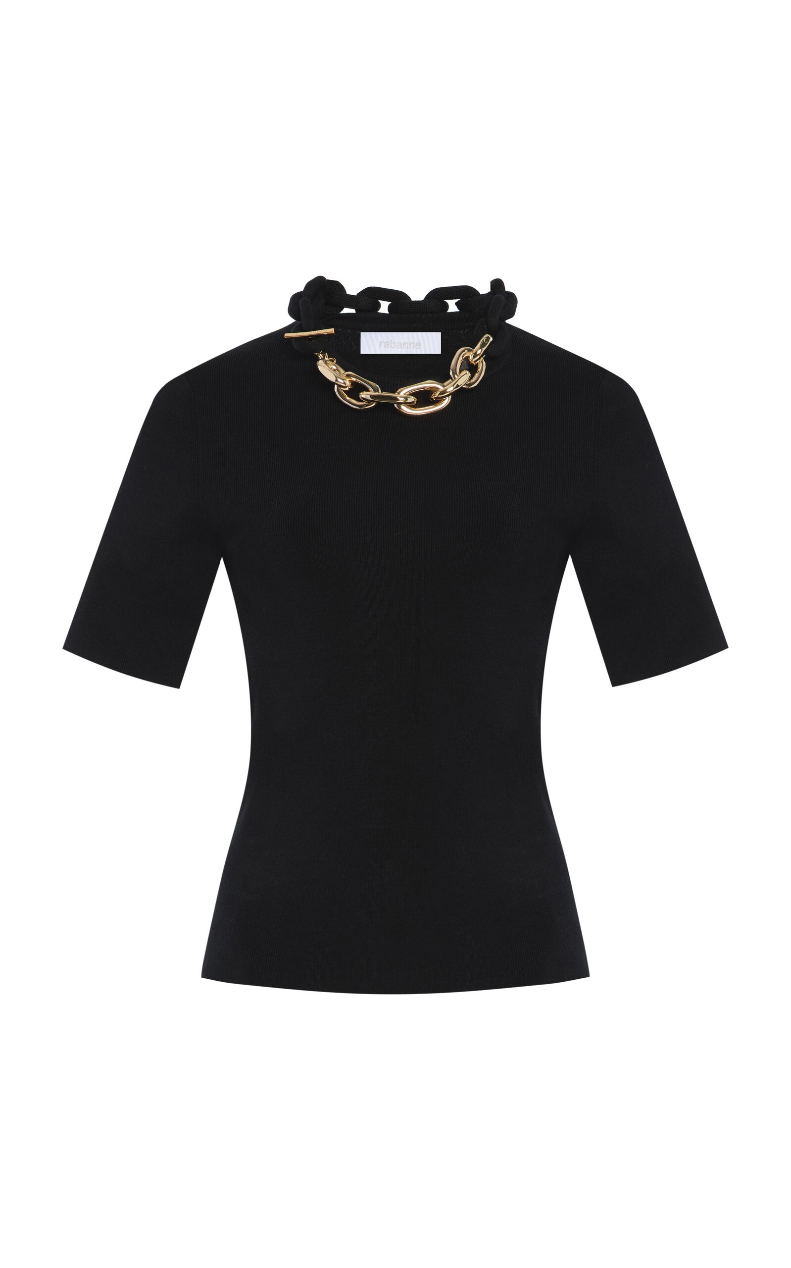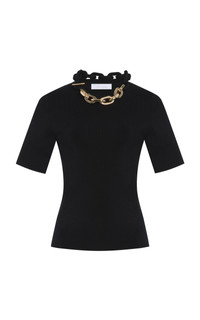 Building off of last season’s layered eclecticism, Julien Dossena channels a British beat, balancing jolts of grunge and a streetwise ease with vintage-inspired luxuries. Made from a soft, stretchy knit using silk an cotton, this crewneck sweater tee is topped with a large two-tone chain at the neck. PRODUCT DETAILS - Resort '25 - Slip on - Composition: 46% silk, 38% cotton, 13% polyamide, 3% elastane - Dry clean - Imported SIZE & FIT - Our model is wearing a size Small - Model is 5'11" with a 30" bust, 24" waist, and 34" hip - Designed for a slim fit