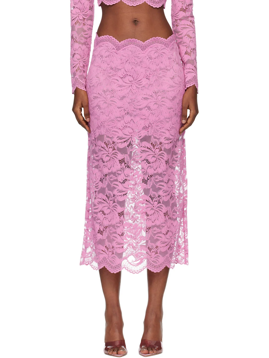 Semi-sheer stretch nylon lace midi skirt. · Scalloped edge at waistband and hem · Button closure at side seam · Partially lined Supplier color: Camelia pink 90% polyamide, 10% elastane. Made in Portugal 261605F092001