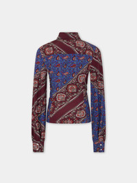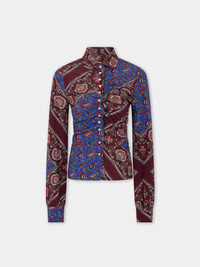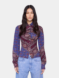 Long sleeves shirt in printed jersey with Paisley bandana motif. - Color: Bandana Paisley : cream / burgundy / blue - Straight collar - Long sleeves - Closure with 13 silver snap buttons. - Composition: 95% Viscose, 5% Elastane - Made in Portugal Size & Fit - Model's height: 180 cm / 5ft 11in - Model wears a size FR 36 / UK 8 / US 4 - This style is true-to-size - We recommend your usual size.