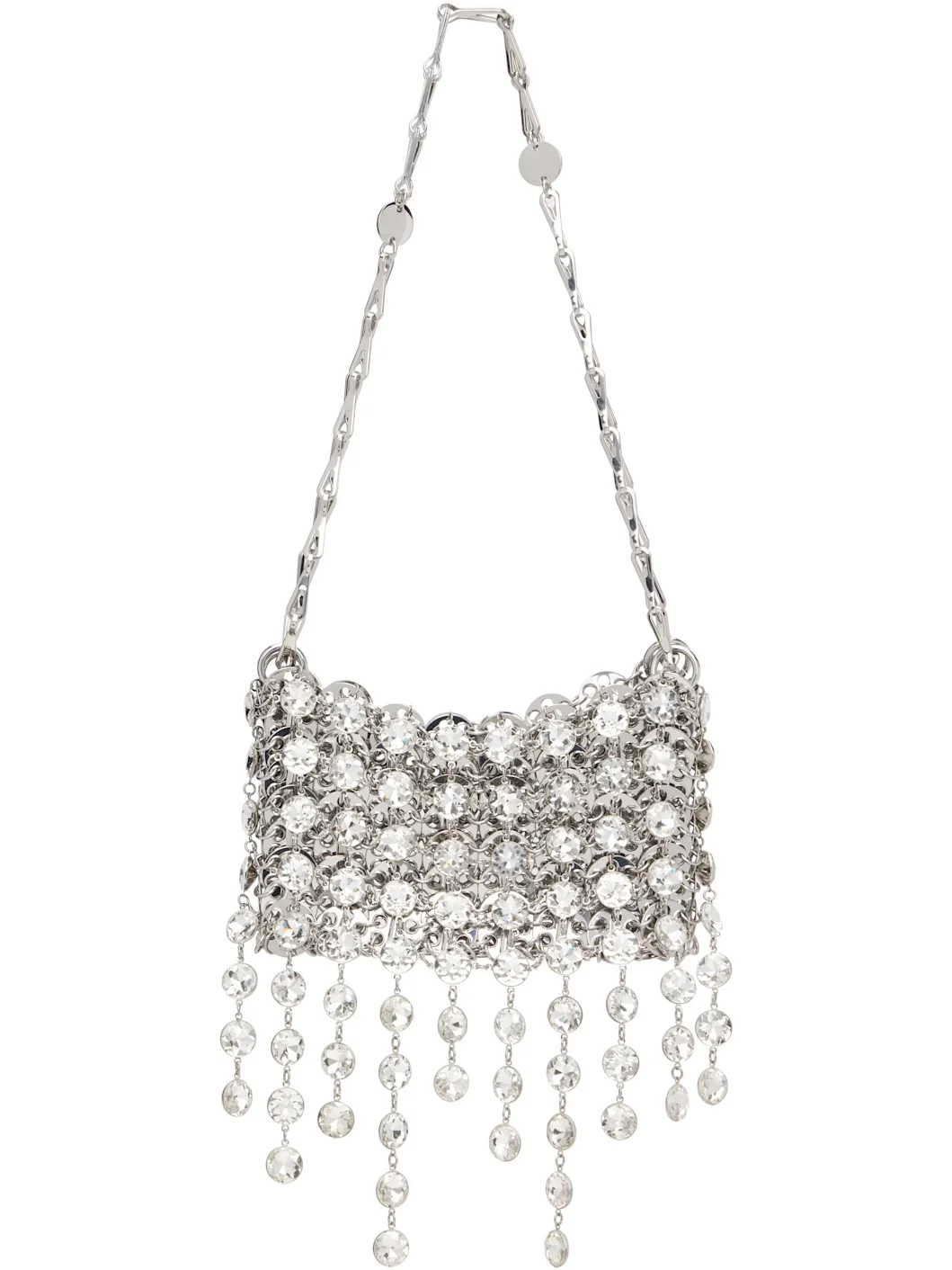 Chain-mail-style shoulder bag. · Sliding chain-link shoulder strap · Logo hardware at strap · Chain overlay with prong-set stones · Magnetic closure · Unlined · H4" x W7" x D1" Supplier color: Silver 100% brass. Made in Madagascar 261605F048006
