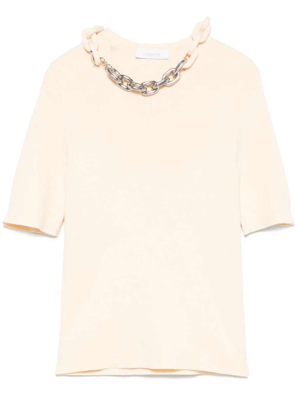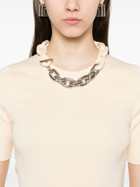 chain link-detail top Highlights - Beige - Crew neck - Short sleeves - Straight hem Imported Composition Silk 48%, Cotton 38%, Elastane 14% SIZE & FIT Model measurements Height 5 ft 10 in(1.78 m) Bust/Chest 33.85 in(86 cm) Hips 36.61 in(93 cm) Waist 26.77 in(68 cm) FittingInformation Designed for a close fit throughout Made with a midweight knit, this piece offers some stretch