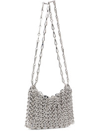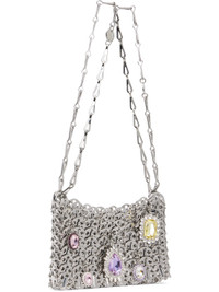 Chain-mail-style shoulder bag. · Sliding chain-link shoulder strap · Logo hardware at strap · Crystal-cut charms at face · Magnetic closure · Unlined · H4.25" x W7" x D1" Supplier color: Silver 100% brass. Made in Madagascar 261605F048003