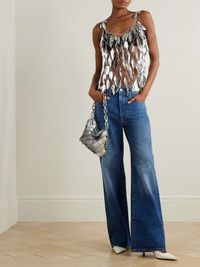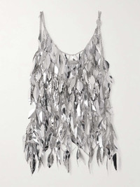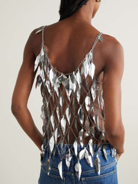 EDITORS'NOTES Rabanne's tank is made from chain carved to look like scores of feathers - they move just as softly as the real things do in the wind. It's designed for a slim fit and reveals a generous amount of skin, so we suggest a camisole or bralette for those who prefer more coverage. SIZE & FIT Model measurements: - Fits true to size, take your normal size - Designed for a slim fit - Mid-weight, non-stretchy material - Model is 180cm/ 5'11" and is wearing a FR 36 - Bust: 80cm/ 31.5" - Waist: 65cm/ 25.5" - Hip: 89cm/ 35" DETAILS & CARE - Silver chainmail - Slips on - 90% brass, 10% steel - Specialist clean
