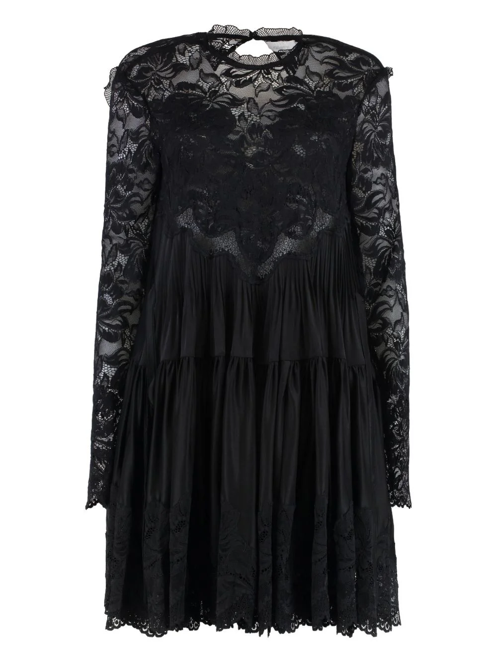floral-lace tiered dress Highlights - Black - Floral-lace pattern - Keyhole back - Tiered skirt - Long sleeves - Rear button fastening Imported Composition Viscose 90%, Elastane 10% Washing instructions Read Manufacturer Guidelines