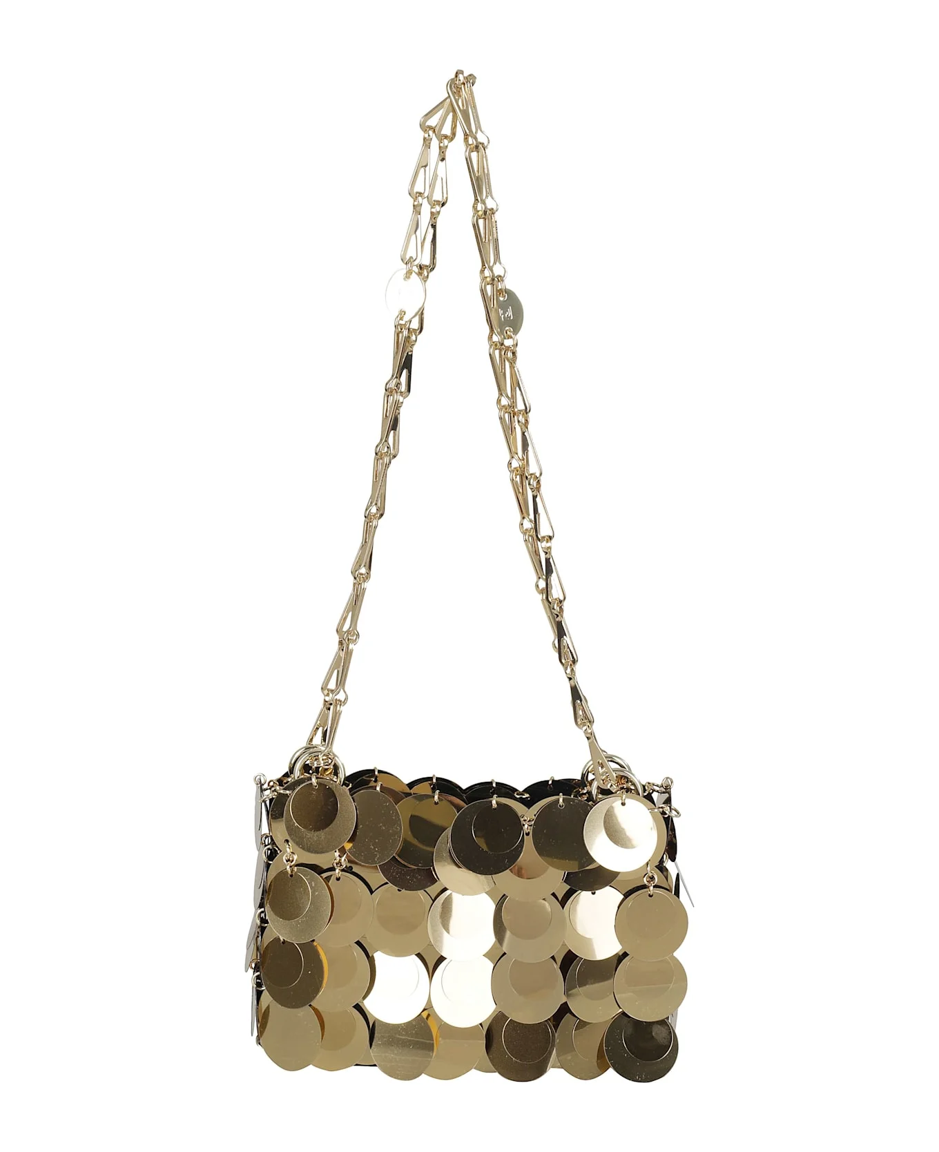 Sparkle Nano bag - Paco Rabanne - light gold color - maxi sequins - steel mesh shoulder strap - magnet closure - h 16cm w 22 cm d. 2. 5 cm Made in: Madagascar Color: Light Gold Model number: 23ASS0137PLX013|097P711
