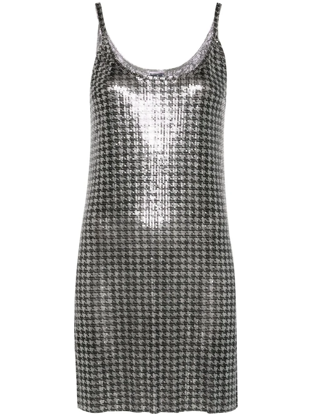 houndstooth mini dress Highlights - Silver-tone/black - Aluminium - Chainmail effect - Houndstooth pattern - U-neck - Sleeveless - Shift style - Unlined - Straight hem - Thigh-length Imported Composition Aluminium 100% SIZE & FIT Model measurements Height 5 ft 11 in(1.8 m) Bust/Chest 33.07 in(84 cm) Hips 37.4 in(95 cm) Waist 25.19 in(64 cm) FittingInformation Designed for a slim fit that sits just away from the body offering a close yet comfortable fit Made from a midweight non-stretch fabric Washing instructions Specialist Cleaning