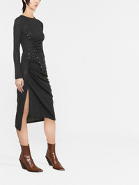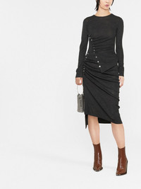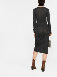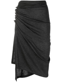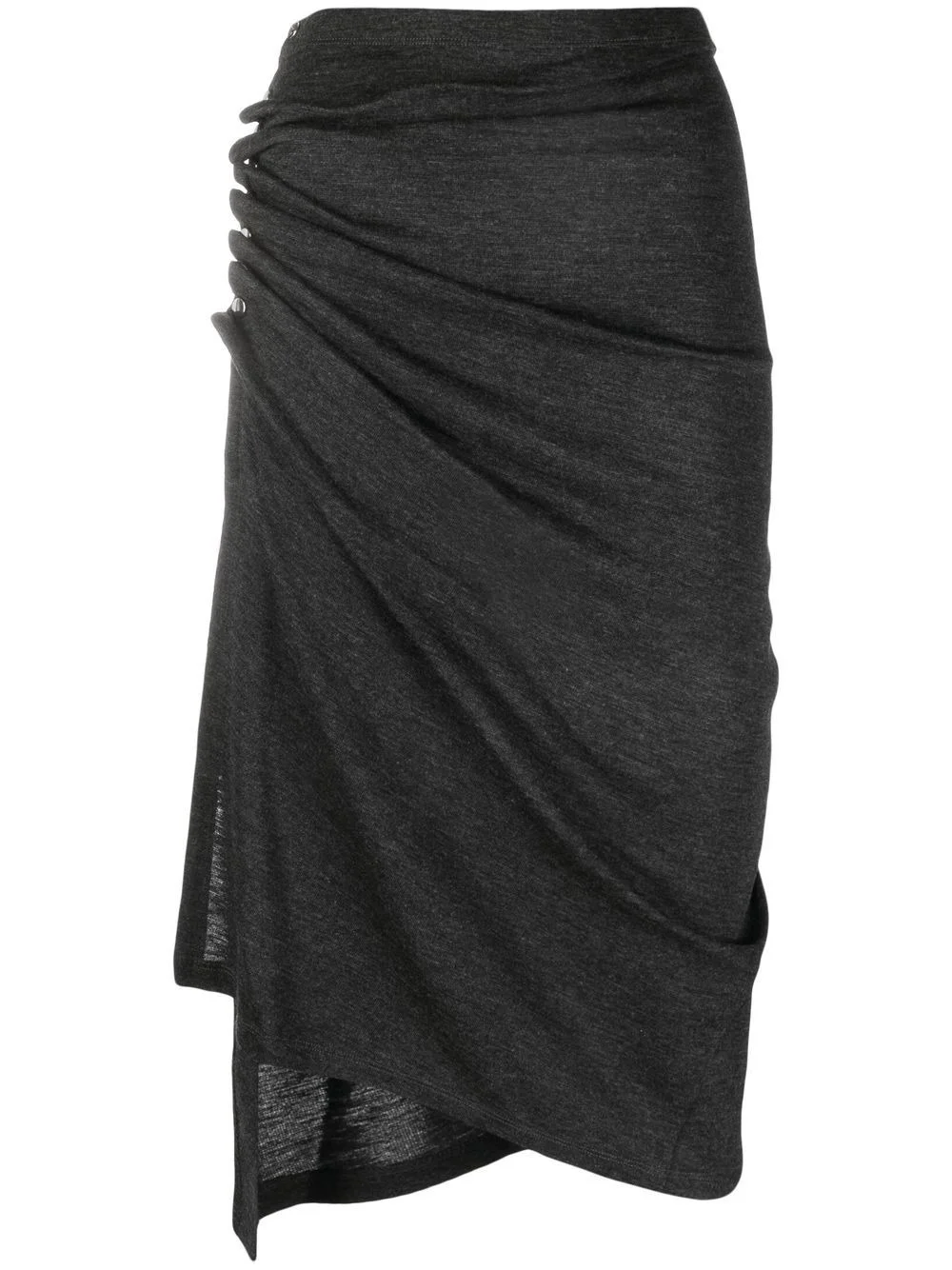 ruched midi skirt dark grey virgin wool blend fine knit ruched detailing pencil design mid-length Imported Composition Virgin Wool 99%, Spandex/Elastane 1% SIZE & FIT Model measurements Height 5 ft 11 in(1.8 m) Bust/Chest 31.49 in(80 cm) Hips 35.43 in(90 cm) Waist 25.19 in(64 cm) FittingInformation This piece fits true to size. We recommend you get your regular size Designed to be fitted at the waist and hips, loose over the leg Made with a mid-weight stretch fabric Washing instructions Dry Clean Only
