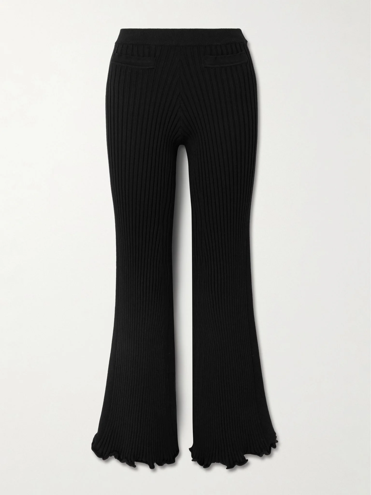 Rabanne's pants are made from ribbed-knit that molds to your shape, emphasizing your curves. Designed to sit on the waist, they fit slim through legs before flaring out to ruffled cuffs. Match your jewelry to the silver-tone, logo-embossed buttons. Size & Fit - Fits true to size, take your normal size - Mid-rise, designed for a slim fit with a flared hem - Lightweight knit - Model is 180cm/ 5'11" and is wearing a size Small Details & Care - Black viscose-blend - Pull on - 70% viscose, 30% polyester - Machine wash