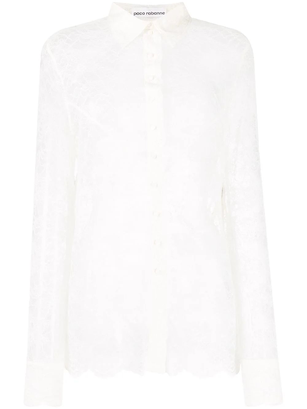 sheer lace shirt Highlights - Ivory - Sheer lace detailing - Scalloped edge - Straight-point collar - Front button fastening - Long sleeves - Buttoned cuffs Imported Composition Nylon 100% SIZE & FIT Model measurements Height 5 ft 10 in(1.78 m) Bust/Chest 31.49 in(80 cm) Hips 37 in(94 cm) Waist 23.62 in(60 cm) FittingInformation This piece fits true to size. We recommend you get your regular size Cut for a slim fit Made with a lightweight fabric Washing instructions Hand Wash
