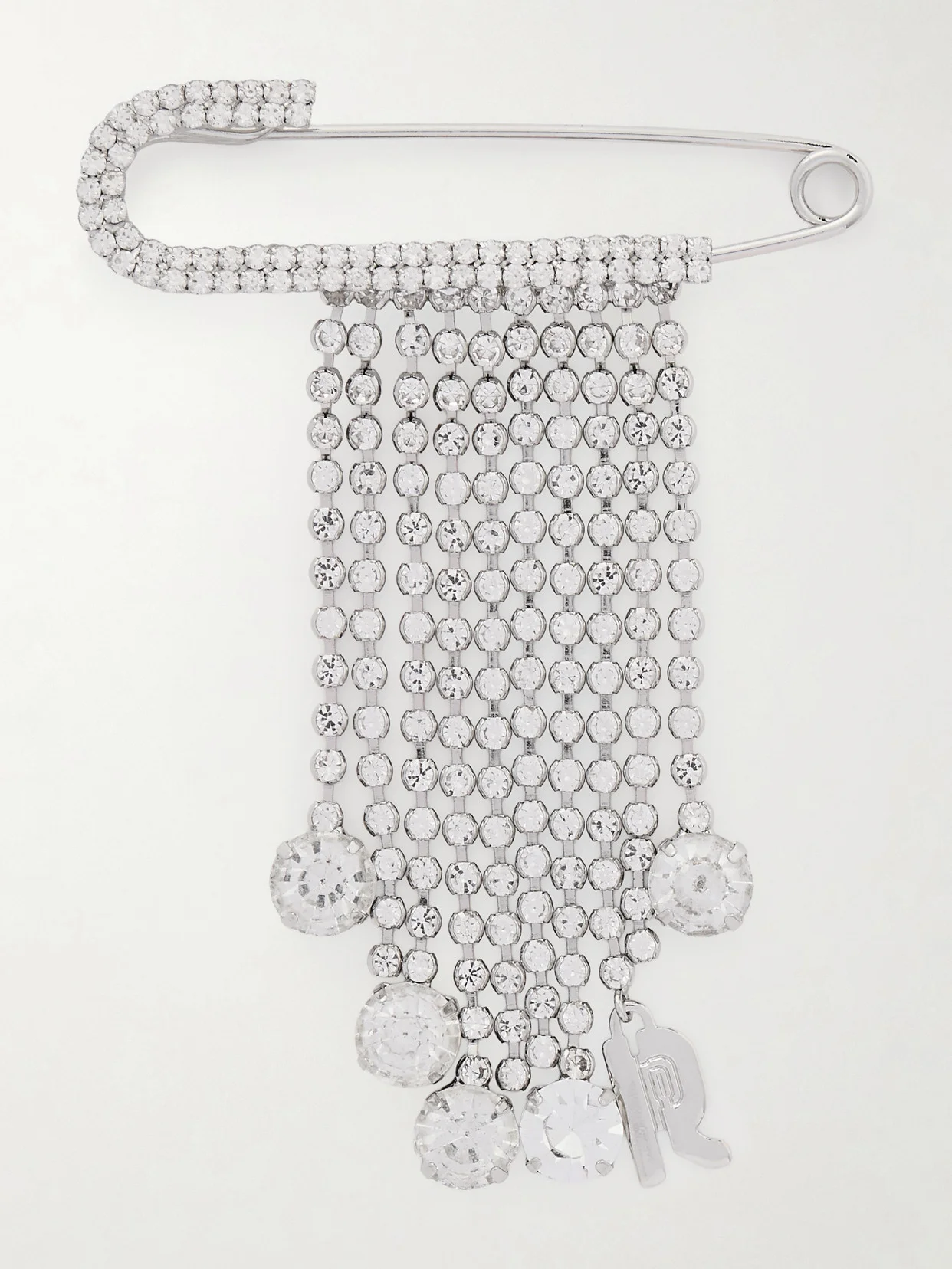 A swathe of chains drape from Rabanne's brooch, leaning into the label's signature chainmail and love of embellishment. With a punk-inspired safety pin fastening, it's made from silver-tone brass and encrusted with crystals.