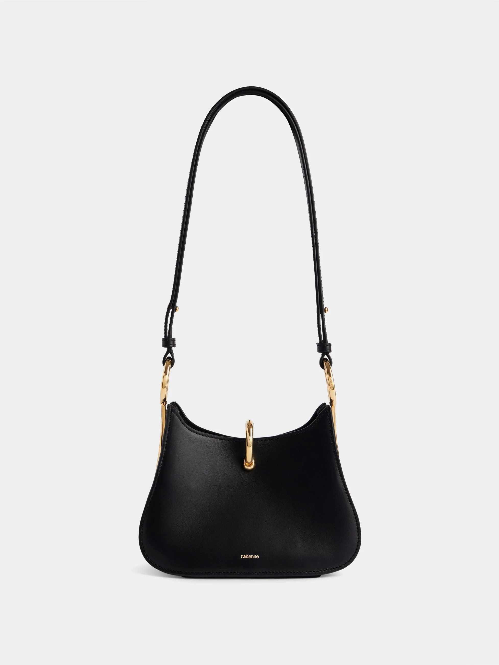 Small Ring leather bag adorned with gold metallic pieces. - Color : Black / Gold - Dimension : 15.5x20.5x8.5cm - Composition : 100% Calfskin - Made in Spain
