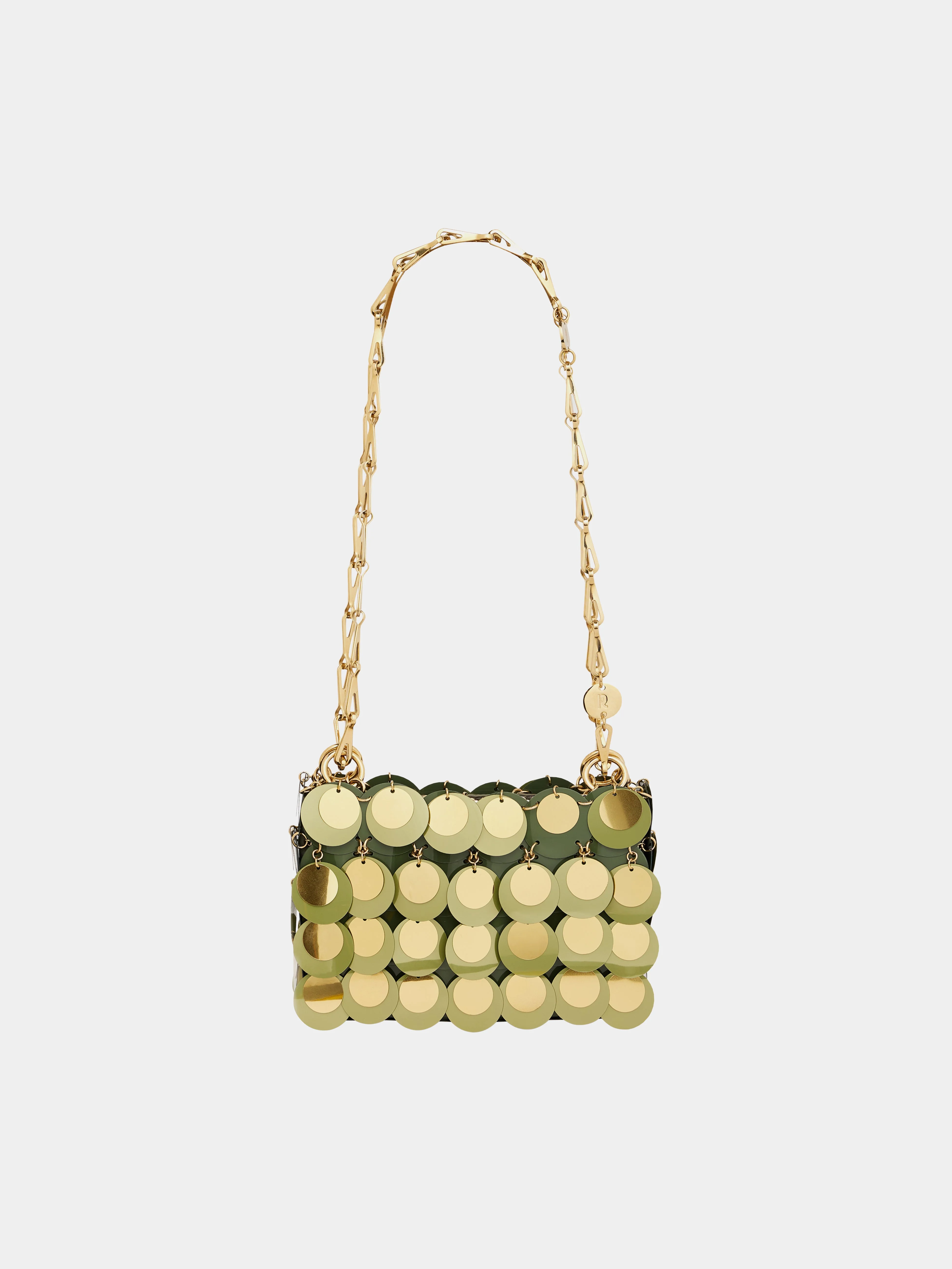 - Color: Khaki / Gold - Iconic gold Rabanne double chain for shoulder carry. - Magnetic closure. DETAILS - Composition: 40% polyester / 40% nylon / 20% stainless steel. - Made in Madagascar