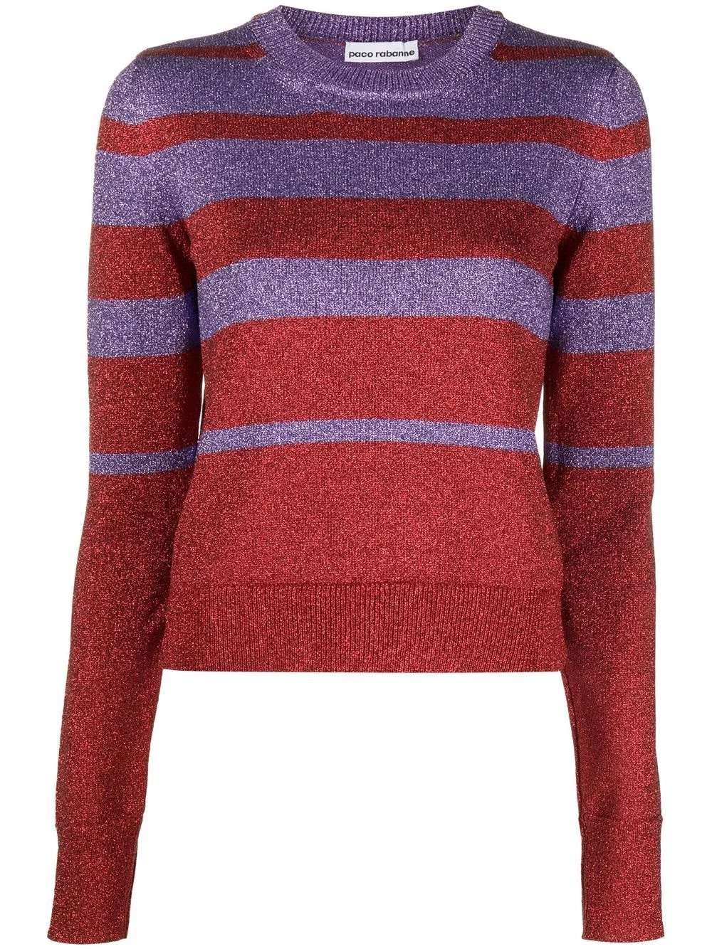 striped crew-neck jumper Reflecting an understated aesthetic, Paco Rabanne presents this jumper. The V-neck silhouette and striped pattern demonstrates this understated style. Imported Composition Metallized Polyester 35%, Polyamide 34%, Cotton 31% SIZE & FIT Model measurements Height 5 ft 10 in(1.78 m) Bust/Chest 31.49 in(80 cm) Hips 35.43 in(90 cm) Waist 24.4 in(62 cm) FittingInformation This piece fits true to size. We recommend you get your regular size Cut for a loose fit Made with a mid-weight fabric