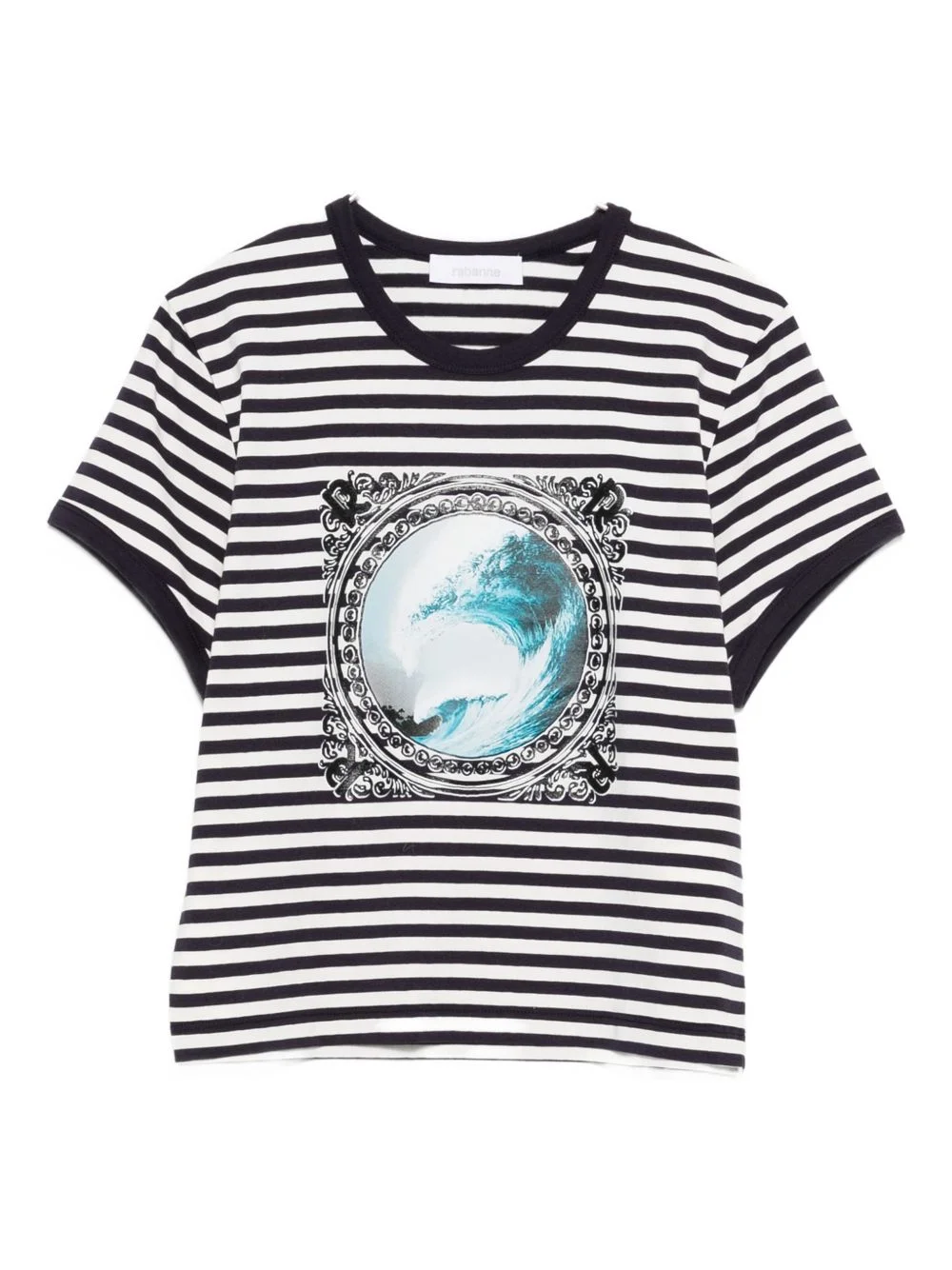 striped graphic top Highlights - Blue - Striped - Graphic print - Round neck - Short sleeves - Ribbed trim Imported Composition Cotton 95%, Elastane 5% SIZE & FIT Model measurements Height 5 ft 10 in(1.78 m) Bust/Chest 33.46 in(85 cm) Hips 36.22 in(92 cm) Waist 23.22 in(59 cm) Washing instructions Machine Wash