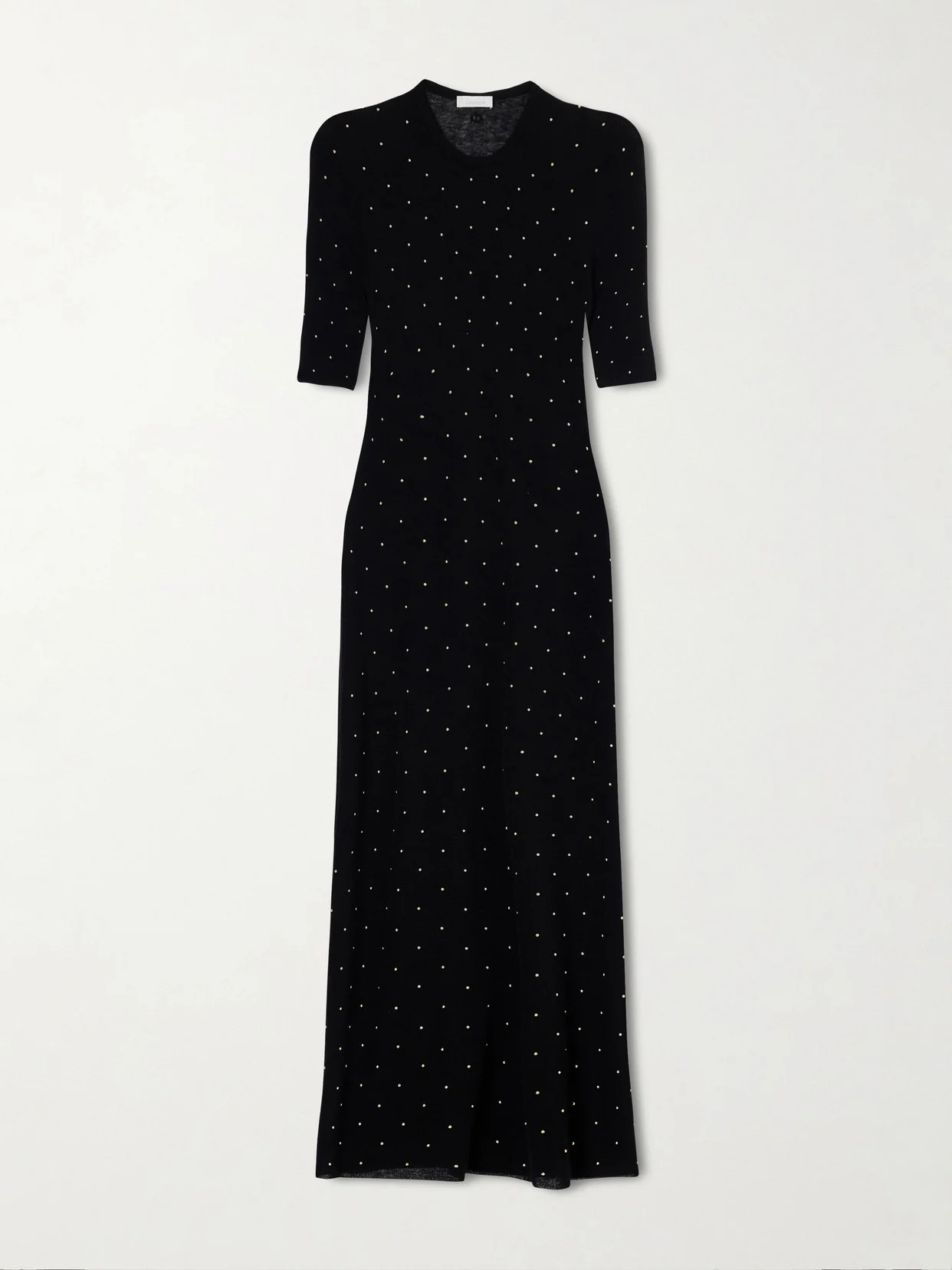 Look closely and you'll see that Rabanne's dress isn't printed but studded all over, creating a subtle, glistening finish. It's knitted from lightweight wool-blend for a glove-like fit - choose accessories which won't snag the delicate fabric.