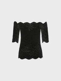Short-sleeve top in lace adorned with studs. - Color: Black - Stretch fabric - Boat neck - Short sleeves - Composition: 90% polyamide, 10% elastane - Made in Tunisia Size & Fit - Model's height: 180 cm / 5ft 11in - Model wears a size FR 36 / UK 8 / US 4 - This style is true-to-size - We recommend your usual size.