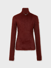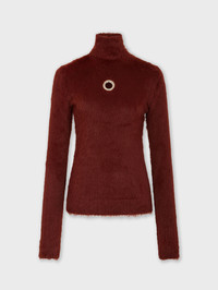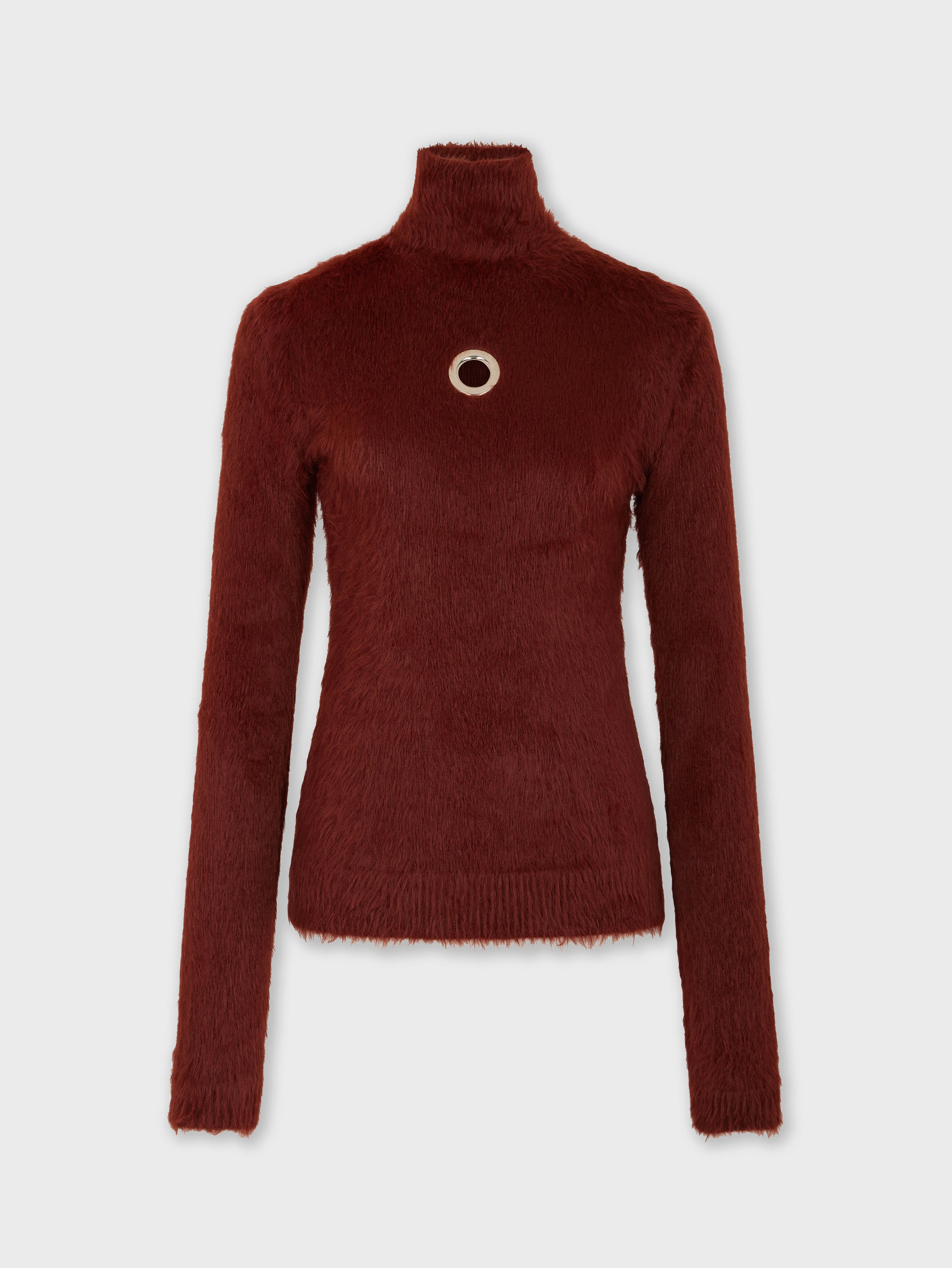 Turtle-neck top with long sleeves in brushed technical knitted yarns featuring silver metal eyelet detail. - Color: Brown - Stand collar - Long sleeves - Composition: 100% Polyamide - Made in Italy Size & Fit - Model's height: 180 cm / 5ft 11in - Model wears a size FR 36 / UK 8 / US 4 - This style is true-to-size - We recommend your usual size.
