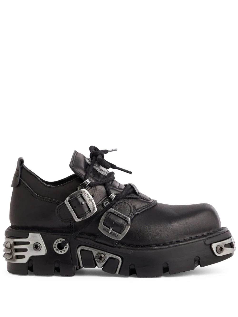 x New Rock leather derby shoes Highlights - Black - Leather - Silver-tone logo plaque - Metal details - Logo-engraved silver-tone hardware - Logo plaque at the tongue - Round toe - Front lace-up fastening - Two buckle-strap fastenings - Pull-tab at the heel - Chunky rubber sole Imported Composition Leather 100%