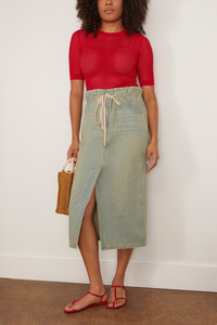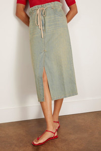 The Rachel Comey Carta Skirt features the relaxed look and feel you love from this designer. This midi skirt is crafted in washed denim with a drawstring waistband. Wear yours with a t-shirt and sandals. FIT DESCRIPTION MODEL MEASUREMENTS - Fits true to size, take your normal size - Denim skirt - Midi length - Relaxed fit - Front slit - Drawstring paperbag waistline - 100% Cotton - Celeste is wearing a size 2 - Bust: 35" - Waist: 25.5" - Hips: 34" - Height: 5’10”