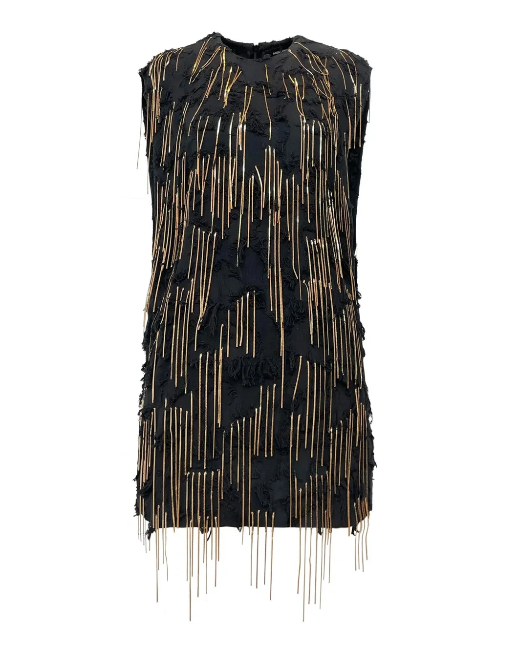 The Corte Dress in Black by Rachel Comey is a sleeveless mini dress featuring fringed embellishments with a round neckline and raw edges.