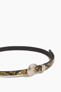 The Rachel Comey Cowboy Waist Belt in Yellow Multi is a thin leather belt in snakeskin-embossed leather with silver engraved buckle for a Western-inspired detail. FIT DETAILS - Thin belt - 100% Leather, snakeskin-embossed - Silver engraved buckle