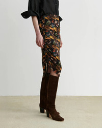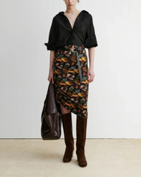 The Dible Skirt in Jersey in the color Black Multi by Rachel Comey is a high waisted midi skirt that features subtly stretchy Mr. Fox printed jersey,asymmetrical draped hem and a drawstring tie at the side. Your perfect graphic mid-length skirt. - Material: 96% Viscose, 4% Elastane - Details: Made in USA. - Fit: Regular. High waisted. - Style it with: An oversized sweater and midi boot for the perfect fall look . - #254W-555-S1870