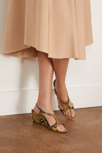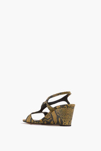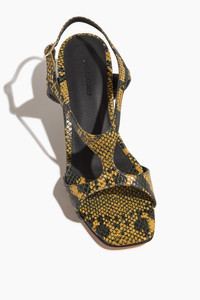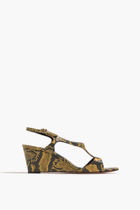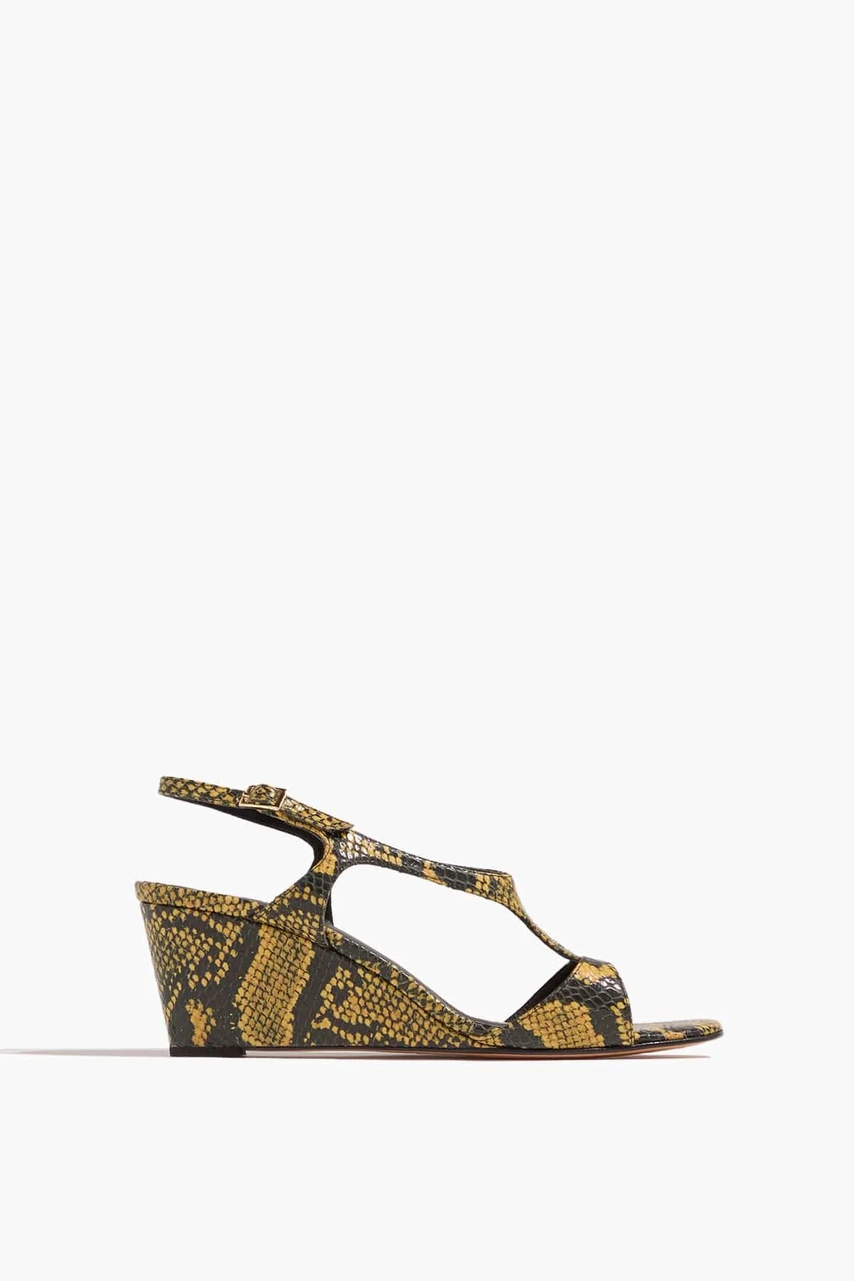 The Rachel Comey Mursell Wedge in Yellow Multi is a yellow snakeprint-embossed leather wedge heel with strappy design. FIT DETAILS - 100% Leather, snakeskin-embossed - Wedge heel - Buckle closure at ankle