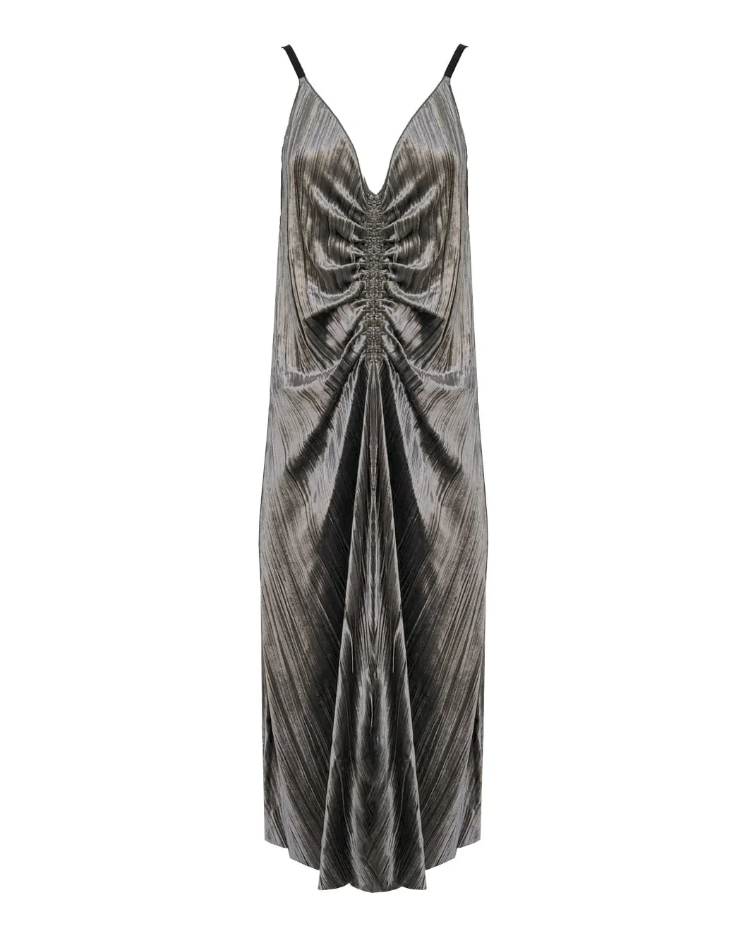 FINAL SALE The Namur Dress in Gunmetal by Rachel Comey is a silk velvet midi dress featuring contrasting straps, low back, and gathered detail at the center front.