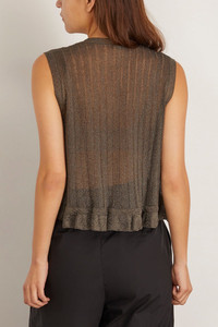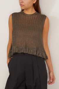 The Rachel Comey New Aires Top is crafted in a beautiful metallic knit. You'll love the loose silhouette of this top with a ruffled hemline. Wear yours with jeans and flats. FIT DESCRIPTION MODEL MEASUREMENTS - Fits true to size, take your normal size - Sleeveless sweater - Loose fit - Ruffled hemline - Metallic threading - 100% 74% Viscoe 26% Lurex - Emma is wearing a size XS - Bust: 32” - Waist: 25” - Hips: 34” - Height: 5’7”