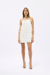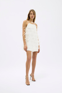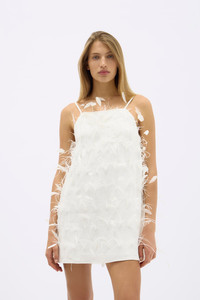 The Sutton is designed for a classic A-line cut that’s dancing with floaty feathers. The square neckline is held together with slender straps and the design lands on a modern mini hem. It’ll really be the talk of the party. - Coque feather detail - Shift silhouette - Designed to sit off the body - High neckline with straps - Centre back zip closure - Fixed straps - Fully lined - Micro mini length - Coque feathers may break with wear handle with care - This style fits true to size Size and Fit Runs true to size, we recommend taking your usual size. Model is 5'10 and wears a Rachel Gilbert Size 1 [AU/UK 8 | US 4]. Fabrication Embellished Tulle 100% Viscose Care Dry Clean Only See sewn in label for further care instructions