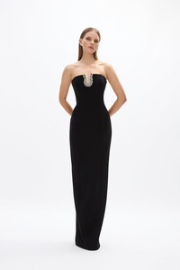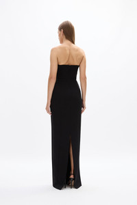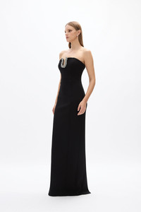 A timeless classic, the Atticus Gown features signature Rachel Gilbert construction forming a slim-fitting and body-contouring silhouette with internal corsetry and waist tapes. Adorned with a hand-twisted and embellished u-shape embellishment, the Atticus Gown upgrades the classics LBD with semi-embellishment. Styled with the Attie Earring. Size and Fit Runs true to size, we recommend taking your usual size. Model is 5'9 and wears a RG 1 = US 4 = AU/UK 8. - Stretch crepe fabrication - Full length - Fitted silhouette - Sweetheart strapless neckline - Under wire - Fully boned - Adjustable elastic waist tape to cinch in the waist - Silicone taping on the inside of the bust for a firm hold on the body - Invisible zip Fabrication Stretch Crepe Main: 71% Acetate 29% Spandex Care Dry Clean Only See sewn in label for further care instructions
