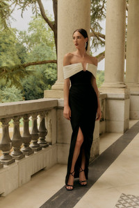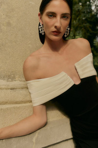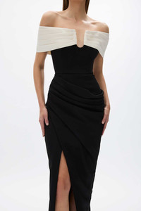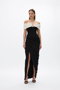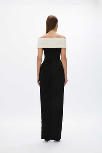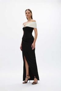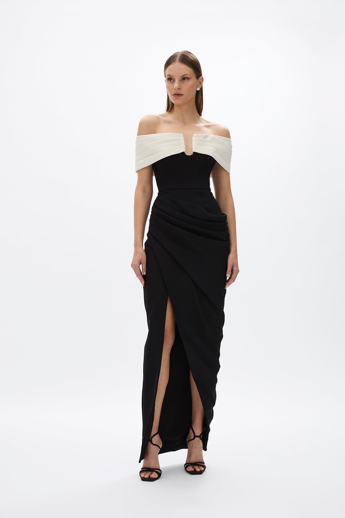 Refined elegance depicts the Aven Gown, designed with internal corsetry to define shape before falling to relaxed floor length silhouette with soft drape over hips and side split. The Aven Gown is detailed with a U-shape neckline across a pleated off the shoulder sleeve. Details & Fit Runs true to size, we recommend taking the size closest to your bust & waist measurements. Model is 5'10 and wears a RG 1 = US 4 = AU/UK 8. - Fitted silhouette - Full length - Off the shoulder sleeve is elasticated for snug fit - U wire in centre front - Invisible zip - Fully Boned internals - Elasticated waist tape Fabric & Care Stretch Crepe Main: 96% Viscose 4% Spandex Lining: 96% Viscose 4% Spandex Spot clean only See sewn in label for further care instructions