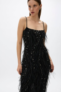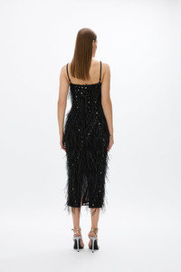 The Cynthia Dress welcomes classic Rachel Gilbert detailing with hand placed and sewn ostrich feathers balanced with hand embellished claw-stones and sequins to catch light at every turn. Cut to a column midi length silhouette that skims the body. Details & Fit Runs true to size, we recommend taking your usual size. Model is 5'10 and wears a RG 1 = US 4 = AU/UK 8. - Fitted silhouette - Midi length - Square neckline - Spaghetti straps - Hand beaded - Individually hand placed and sewn ostrich feathers - Invisible zip Fabric & Care Embellished Main: 100% Nylon tulle Lining: 100% Viscose Dry clean only See sewn in label for further care instructions
