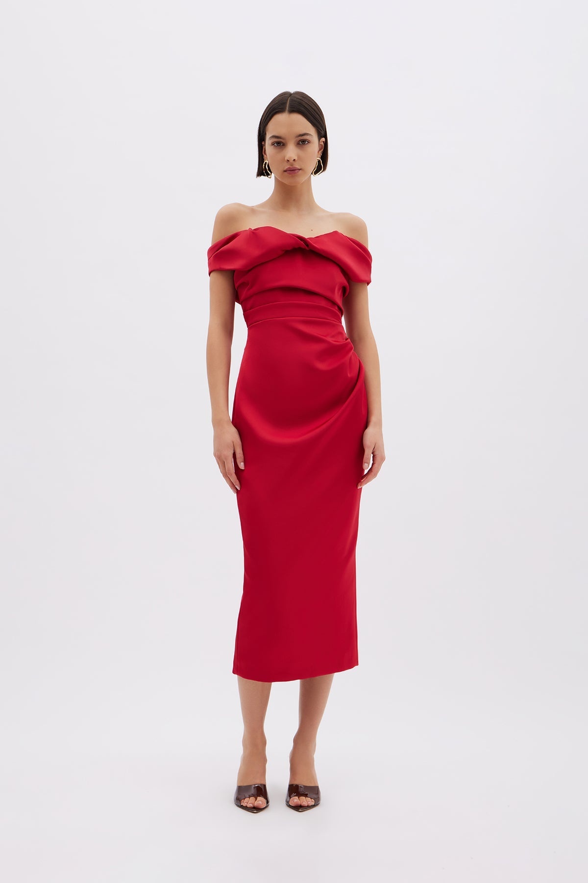 Be the talk of the party with the Daria dress. Imagined in soft satin, the decolletage-highlighting neckline is beautifully draped. It’s designed for a streamlined shape, with space to show off a precious pair of heels. - Internal fitted bodice - Off the shoulder design - Slim fit silhouette - Fabric gathers at bust - Mid length silhouette - Back zip closure - Fits true to size Size and Fit Runs true to size, we recommend taking your usual size. Model is 5'10 and wears a Rachel Gilbert Size 1 [AU/UK 8 | US 4] Fabrication Bonded Satin 100% Polyester Care Spot clean, or if required, gentle cold machine wash See sewn in label for further care instructions