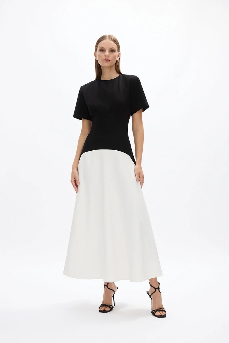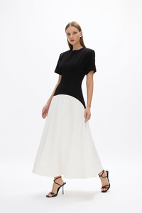 Available for pre-order, shipping end of October 2024. Designed as an effortless sartorial update to your Summer Wardrobe, the Dover Dress blends elegance and sophistication with a timeless two-tone contrast design. Fitted through the waist falling to a flowing a-line skirt complete with slim short sleeves. Size and Fit Runs true to size, we recommend taking your usual size. Model is 5'9 and wears a Rachel Gilbert Size 1 [AU/UK 8 | US 4]. - Stretch crepe fabrication - Flared silhouette - Midi length - Round neckline - Short sleeves - Light boning - Invisible zip Fabrication Moss Crepe Main: 97% Polyester 3% Elastane Contrast: 84% Acetate 16% Polyester Lining: 100% Polyester Care Spot Clean Only See sewn in label for further care instructions
