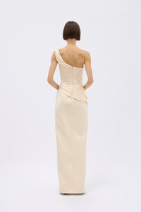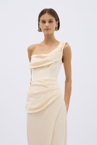 Exude the Goddess energy you posses with none other than the Duke gown. It’s brought to life with a one-shoulder neckline that leads to a boned bodice inspired by corsetry. The beautiful drapery of the fabric layer over a skimming skirt that’s accentuated with a split. - Fully boned - Elastic waist tape - Front split - One shoulder design with peaked apex - Draped bodice and neckline - Visible boning channels - Draped skirt over hips - Maxi length - This style fits true to size Size and Fit Runs true to size, we recommend taking your usual size. Model is 5'10 and wears a Rachel Gilbert Size 1 [AU/UK 8 | US 4]. Fabrication Bonded Satin 100% Polyester Care Dry Clean Only See sewn in label for further care instructions