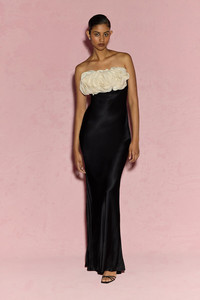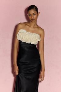 The ultimate black tie silhouette, the Fiorella features a sculptural hand placed floral inspired bust line reflective of a season in-bloom. Placed over a satin shine silhouette designed to effortlessly skim the body before falling to a floor grazing silhouette. Crafted to naturally cinch through the waistline to create an organic hourglass silhouette. Details & Fit Runs true to size, we recommend taking your usual size. Model is 5'10 and wears a RG 1 = US 4 = AU/UK 8. - A-line silhouette - Full length - Strapless with internal boned bust shelf - Sculptural hand placed Silk floral detail at bust - Invisible zip Fabric & Care Satin Main: 53% Rayon 47% Viscose Lining: 100% Polyester Dry clean only See sewn in label for further care instructions