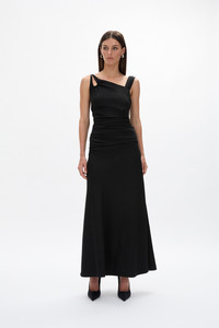 Details & Fit This style runs true to size, we recommend taking your waist measurement to indicate your size. This garment can be altered with ease. The length of the dress can be tailored by a professional seamstress. Model is 5'10 and wears a RG 1 = US 4 = AU/UK 8. Heel height is 12 cm. - Stretch woven fabrication - Main fabric is draped over lining - Gathered channel creates keyhole at asymmetrical neckline - Rouleau tie passes through channel and ties in loop at back neckline edge - Shape is fit and flare – tighter at waist and A-line shape through the skirt - Hidden zip at left side seam - Internal boning through the waist - This silhouette has a relaxed slim fit, if you preferred a more fitted look we recommend sizing down. Fabric & Care Stretch Woven Main: 53% Polyester 45% Rayon 2% Spandex Lining: 100% Polyester Dry clean only See sewn in label for further care instructions