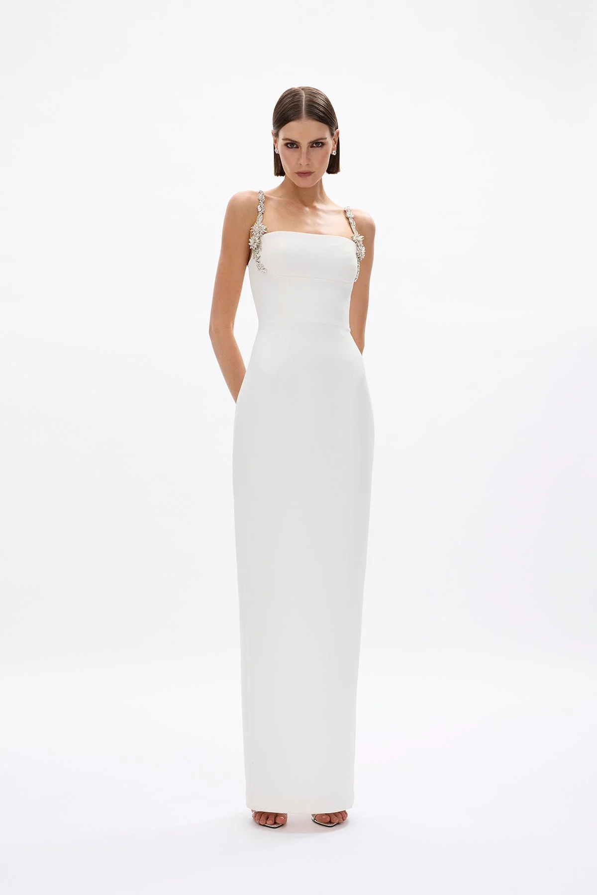 Details & Fit This style is true to size; we recommend using your bust, waist, and hip measurements to select the size that most closely matches our size chart.Model is 5'9 and wears size RG 0 / US 2 - Full-length column silhouette - Fitted bodice - Internal corset and waist tape - Hand embellished strap details - Adjustable shoulder straps - Crafted from heavy weighted textured crepe - Back zip closure - Back split Fabric & Care Fabrication: Textured Crepe; 98% Polyester, 2% Spandex | Lining: 100% Polyester Care: Dry Clean Only The Franca Gown is crafted from heavier-weight textured Crepe, a fabric that provides warmth, structure, and a refined drape for a flattering, sculpted silhouette. The lining ensures comfort and smooth movement.