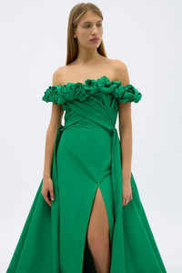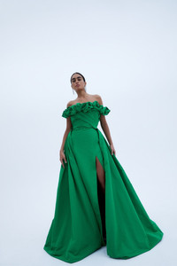Available for pre-order, shipping October 4th. The Henley makes an entrance like no other. It has a fitted bodice that’s folded with whimsical ruffles and has a voluminous skirt in a verdant shade. The beauty is in the gliding movement, marking a real fairy-tale moment. - Fitted bodice and underskirt - Fully boned with elastic waist tape - Elasticated straps with rosette drapes off the shoulder - Front split - Draped bodice - Overskirt with train that gathers at back waist - Silicon tape - This style runs true to size Size and Fit Runs true to size, we recommend taking your usual size. Model is 5'10 and wears a Rachel Gilbert Size 1 [AU/UK 8 | US 4]. Fabrication Woven 100% Polyester Care Dry Clean Only See sewn in label for further care instructions