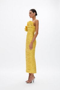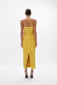 The Jensen welcomes a brand favourite re-imagined with bust detailing of hand draped fans adorned over a ruched column silhouette. Fit with internal corsetry to create a natural hour-glass shape. Size and Fit Runs true to size, we recommend taking your usual size. Model is 5'10 and wears a RG 1 = US 4 = AU/UK 8. - Column silhouette - Midi length - V neck - Strapless - Invisible zip Fabrication Taffeta Main: 45% Nylon 50% Polyester 5% Elastane Lining: 100% Polyester Care Dry clean only See sewn in label for further care instructions