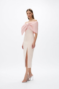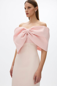 Signature to Rachel Gilbert, the Kace Dress features a textured bow draped across a strapless silhouette. Cut to a flattering column shape designed as a subtle statement with left side split. Fit with internal corsetry and waist tapes to create a natural hour-glass shape. Size and Fit Runs true to size, we recommend taking the size closest to your waist & hip measurement. Model is 5'10 and wears a RG 1 = US 4 = AU/UK 8. - Voluminous bow detail - Fitted Column silhouette - Internal boning in waist - Gripper tape across the neckline - Midi length - Invisible zip Fabrication Carmine Crepe Main: 97% Polyester 3% Elastane Lining: 100% Polyester Care Dry clean only See sewn in label for further care instructions