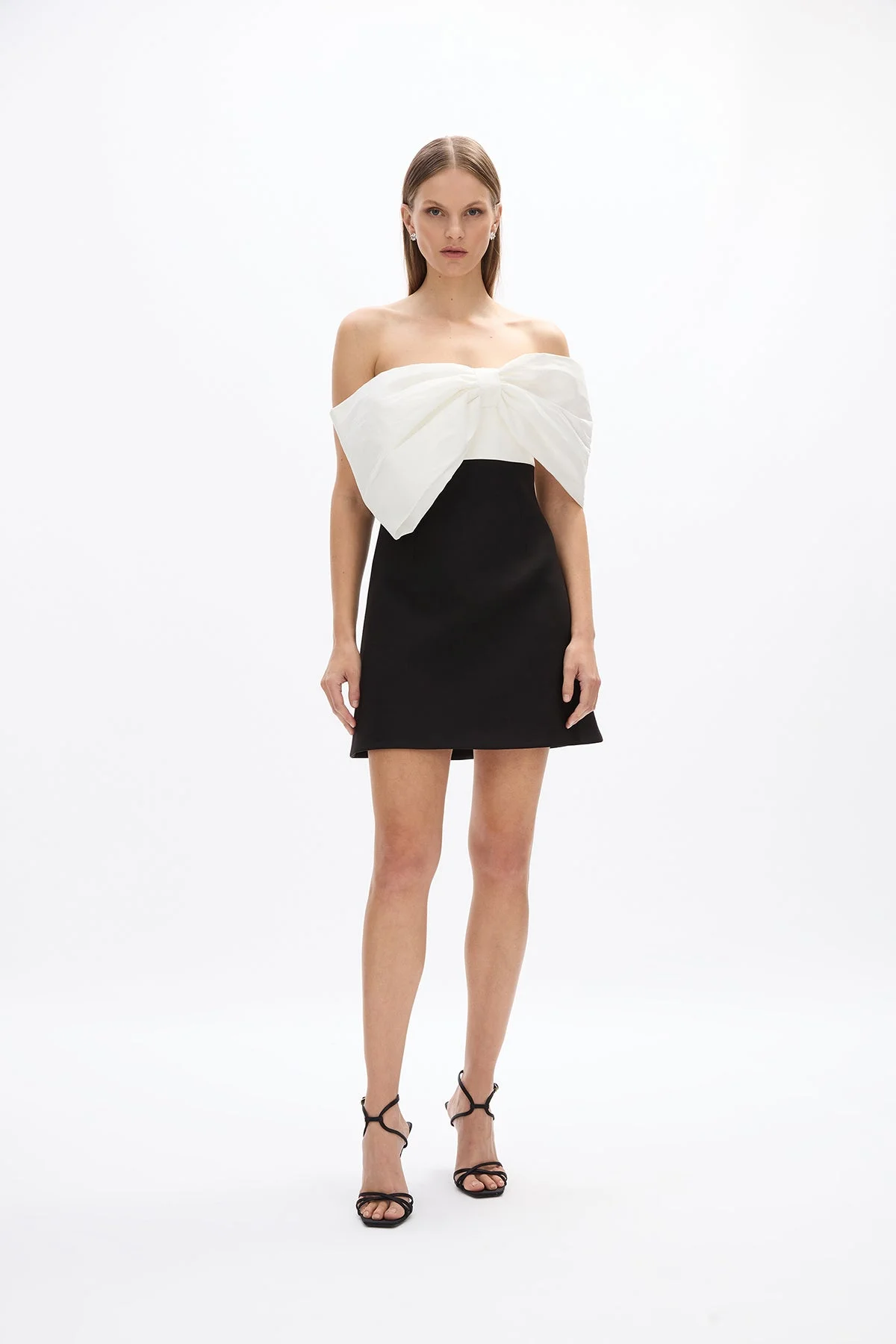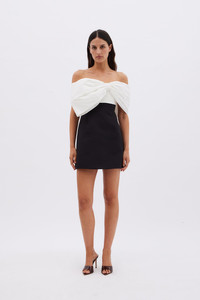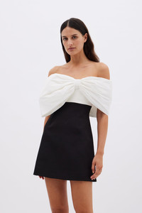 A signature mini, the Kace Mini dress features a soft textured bow draped across a strapless silhouette. Cut to a flattering a-line shape designed as a subtle statement for a modern yet fun touch. - Voluminous bow detail - Fitted to the underbust - Internal boning in waist - Gripper tape across the neckline - A-line skirt - Mini length - Back zip closure - Fits true to size Size and Fit Runs true to size, we recommend taking your usual size. Model is 5'10 and wears a Rachel Gilbert Size 1 [AU/UK 8 | US 4] Fabrication Stretch Taffeta Bow & Carmine Skirt 97% Polyester 3% Elastane Care Dry Clean Only See sewn in label for further care instructions