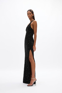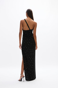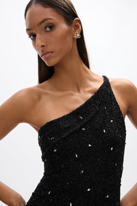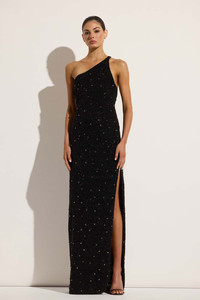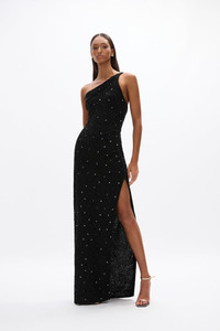 The ultimate black tie silhouette, the Kaito features a one-shoulder and open back detail adorned with individual hand-embellishments. Complete with gathered details reflective of a 'wet-look' style, the Kaito decodes black-tie Summer Soirees. Styled with the Waverly Earring. Size and Fit Runs true to size, we recommend taking your usual size. Model is 5'10 and wears a RG 1 = US 4 = AU/UK 8. - Embellished - Fitted silhouette - Full length - Asymmetrical one shoulder neckline - Lightly boned - Adjustable elastic waist tape to cinch in the waist - Silicone taping on the inside of the bust for a firm hold on the body - Bust cups - Invisible zips Fabrication Embellished Main: 100% Nylon Tulle Lining: 100% Nylon Care Dry Clean Only See sewn in label for further care instructions