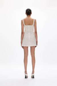 Details & Fit Details & FitThis is a form fitting mini silhouette. Model is 5'10 and wears a RG 1 = US 4 = AU/UK 8 • Fully boned internal bodice. • Hand Embellished. • Square neckline. • Back zip. • No stretch through the waist and bust. • Stretch through the hip. • Internal waist tape. Fabric & Care Hand Embellished Nylon Tulle 100% Nylon Dry Clean Only.