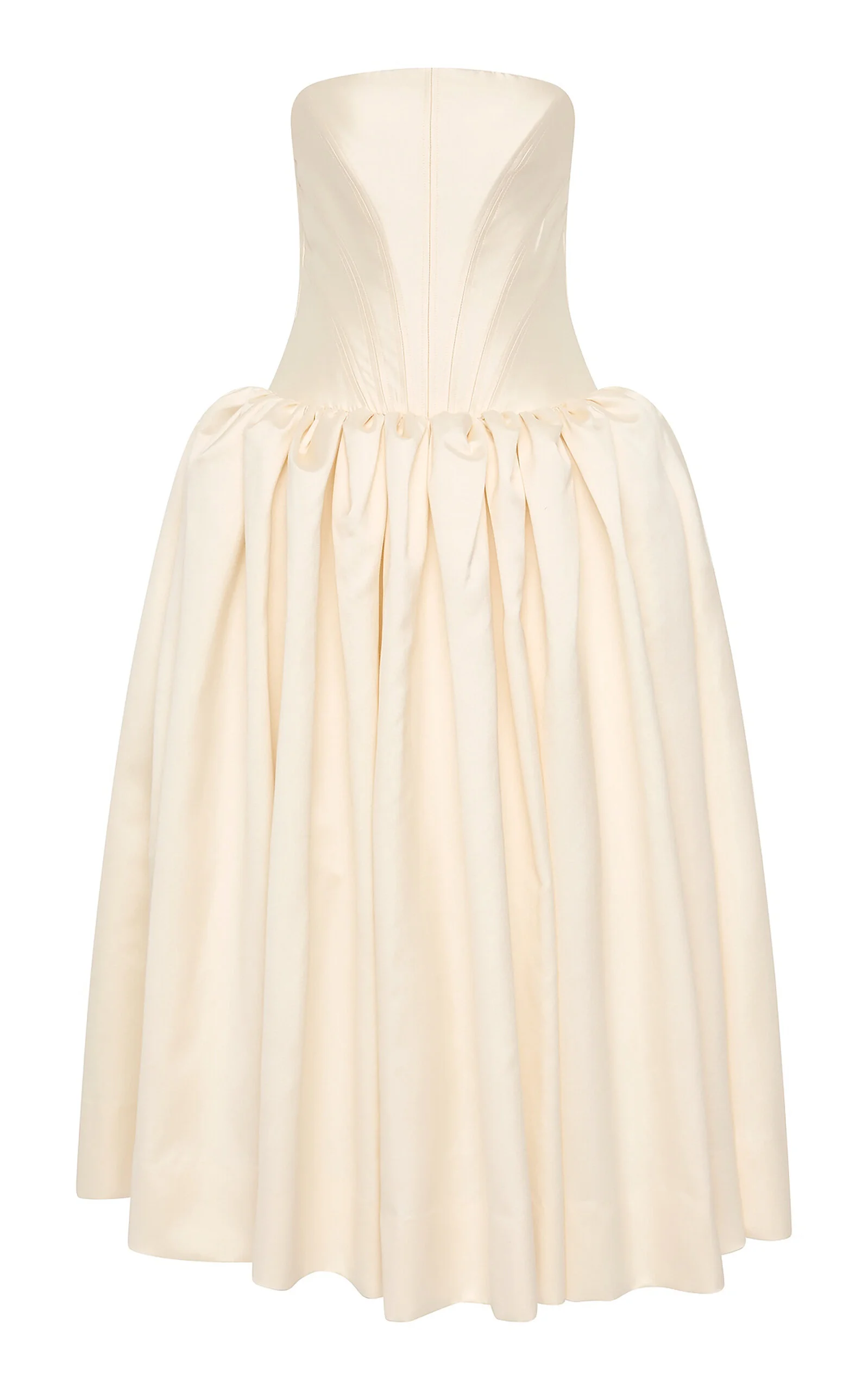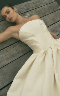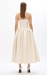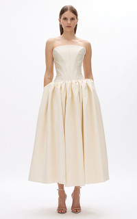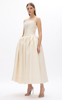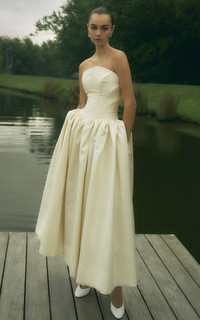 PRODUCT DETAILS - Slim fit, corseted bodice with wire detailing on top, strapless, pleated ball gown skirt with pockets - Zip Fastening Through Back - Lined - Composition: 52%Silk 48% Wool - Color: Ivory - Dry Clean Only - Pre-Fall '25