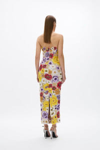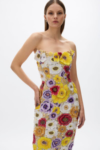 Divine femininity meets a classic column silhouette to create the Kira Dress. Detailed with hand embroidered florals layered with hand embellishment creating the perfect wedding guest silhouette. Crafted internally with corsetry and waist tapes to define an hourglass silhouette. Details & Fit Runs true to size, we recommend taking the size closest to your waist & hip measurements. Model is 5'10 and wears a RG 1 = US 4 = AU/UK 8. - Column silhouette - Midi length - Strapless - Hand embroidered 3D flowers - Fully boned - Waist tape to cinch in the waist - Invisible zip Fabric & Care Embellished Tulle Main: 100% Nylon Tulle Lining: 100% Nylon Dry clean only See sewn in label for further care instructions